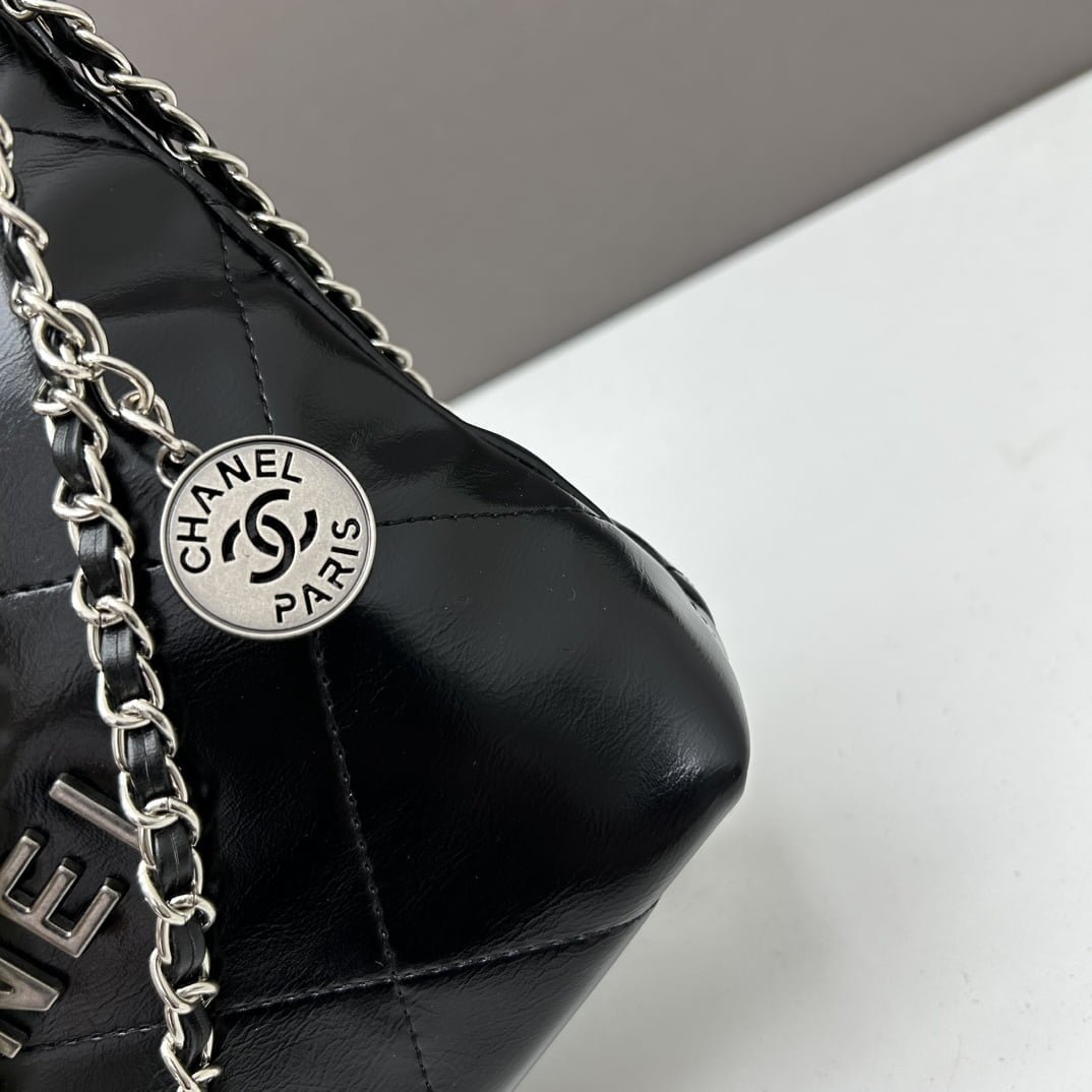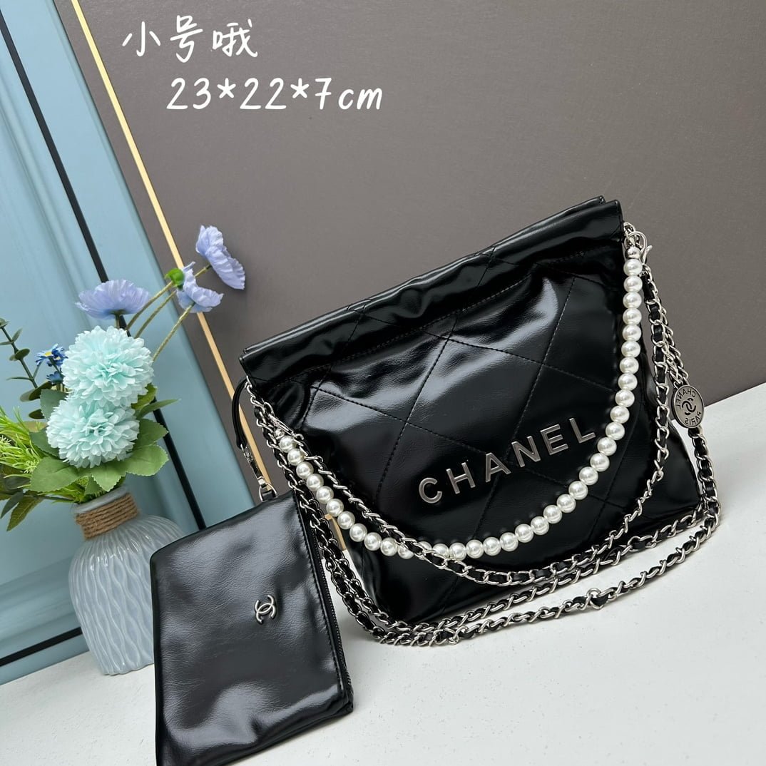 首页 BAGS CHANEL CHANEL Pearl garbage bag black with sliver hardware size: 23*28*22*7cm