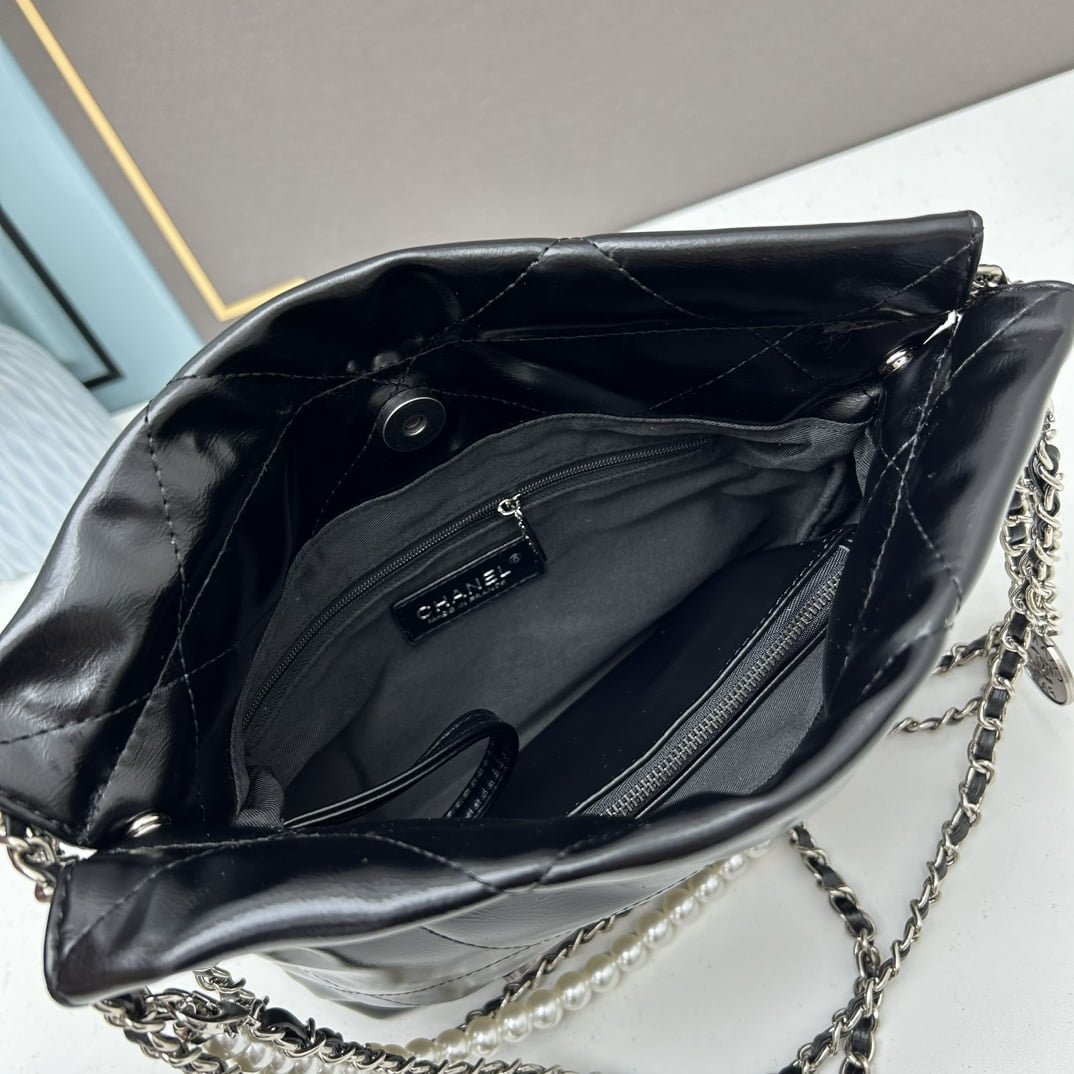 CHANEL Pearl garbage bag black with sliver hardware size: 23*28*22*7cm