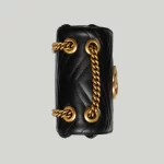 The GG Marmont has become synonymous with the House, thanks to its recognizable matelassé fabric and Double G hardware. Continuously reinvented through the seasons, new shapes are introduced within this signature line, matching Gucci’s contemporary vision. Here, it’s presented in black leather and further enriched with antique gold-toned details.