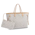 The Neverfull GM tote unites timeless design with heritage details. Crafted from fresh Damier Azur canvas with natural cowhide trim. it is ultra-roomy yet never bulky. with side laces that cinch for a sleek allure or loosen for a more casual look. Slim. comfortable handles slip easily over the shoulder or arm. Lined in colorful textile. it features a removable pouch which can serve as a clutch or an extra pocket.