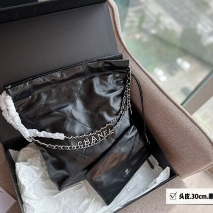CHANEL Pearl garbage bag black with sliver hardware size: 23*28*22*7cm
